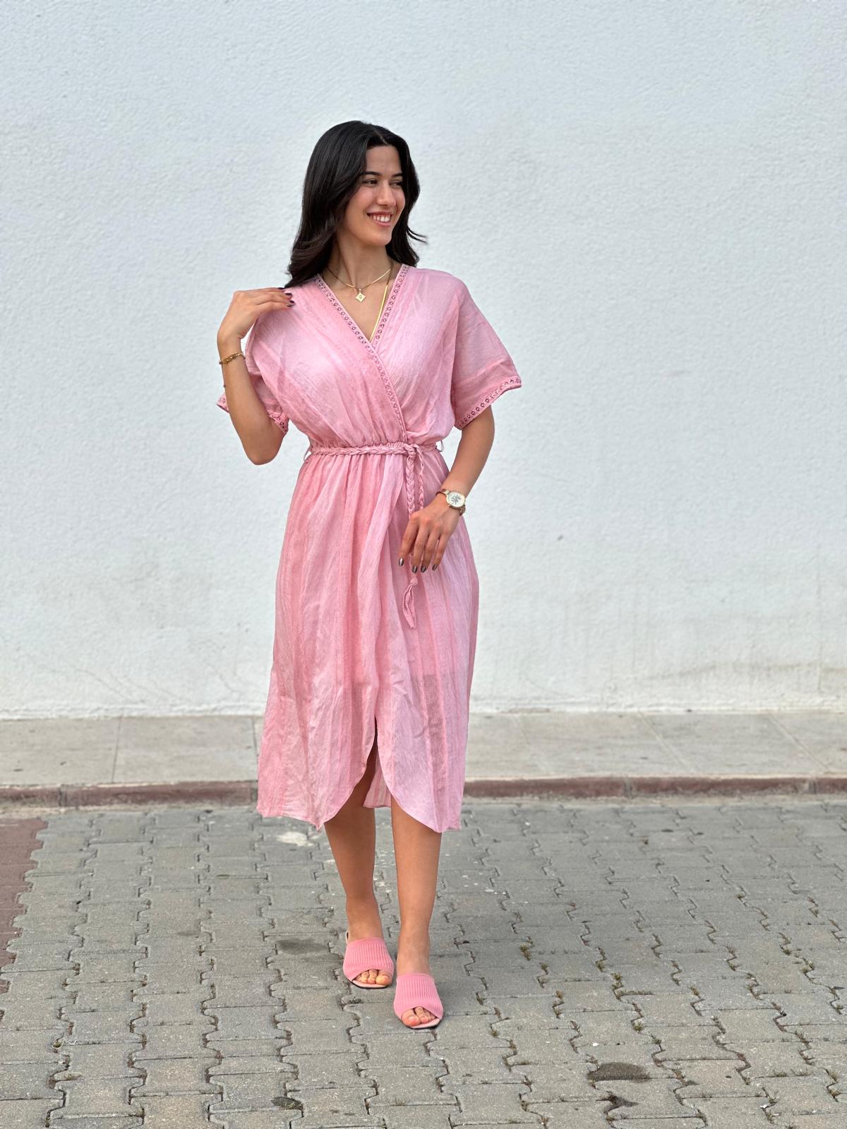 GRENA V YAKA ÖRGÜ KUŞAKLI ÖN YIRTMAÇLI PEMBE ELBİSE