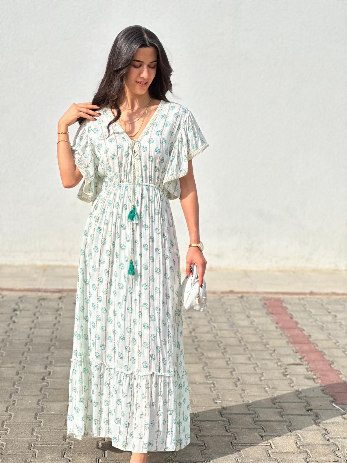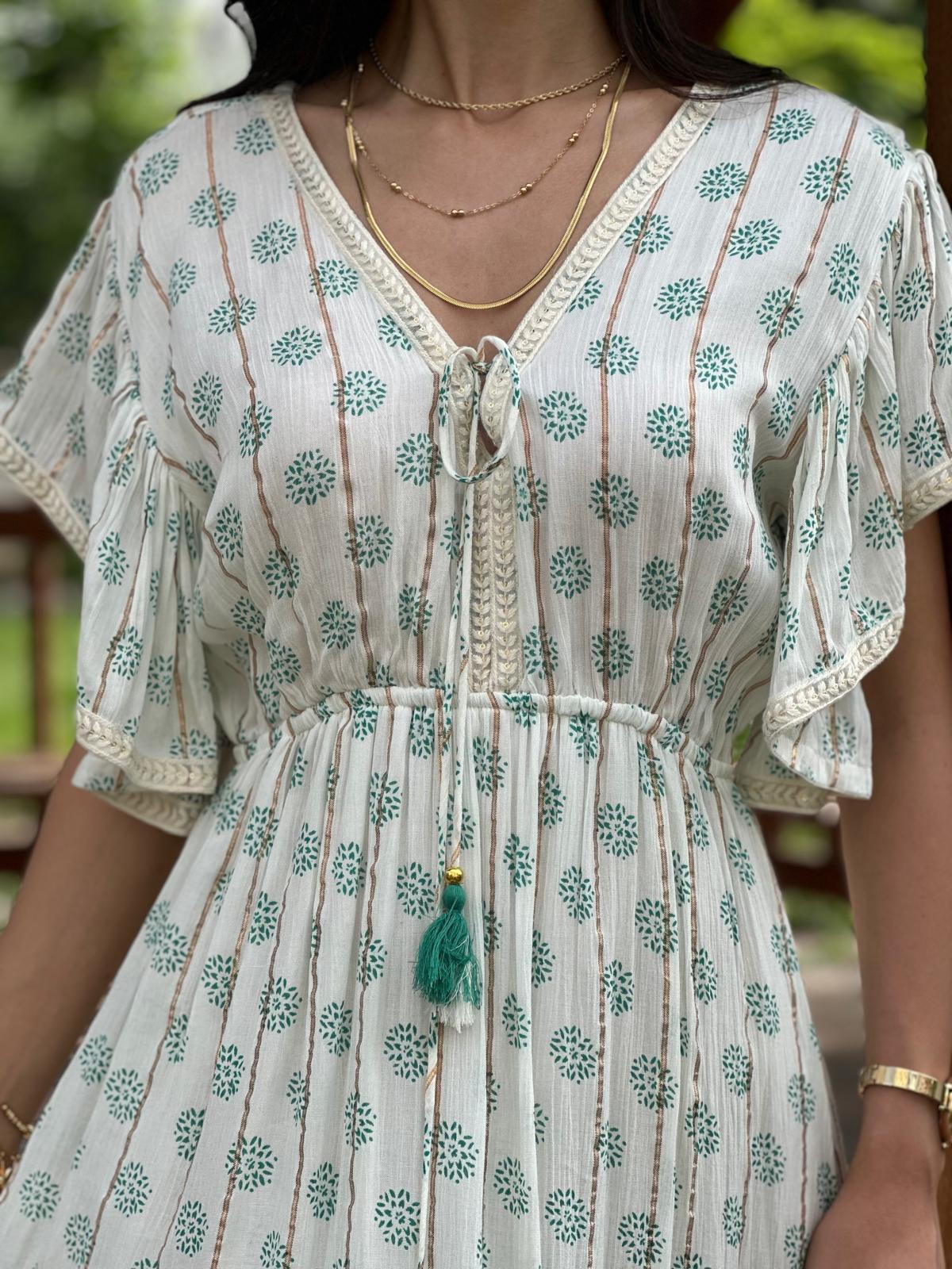 KOL DETAYLI V YAKA UZUN ELBİSE YEŞİL STANDART BEDEN